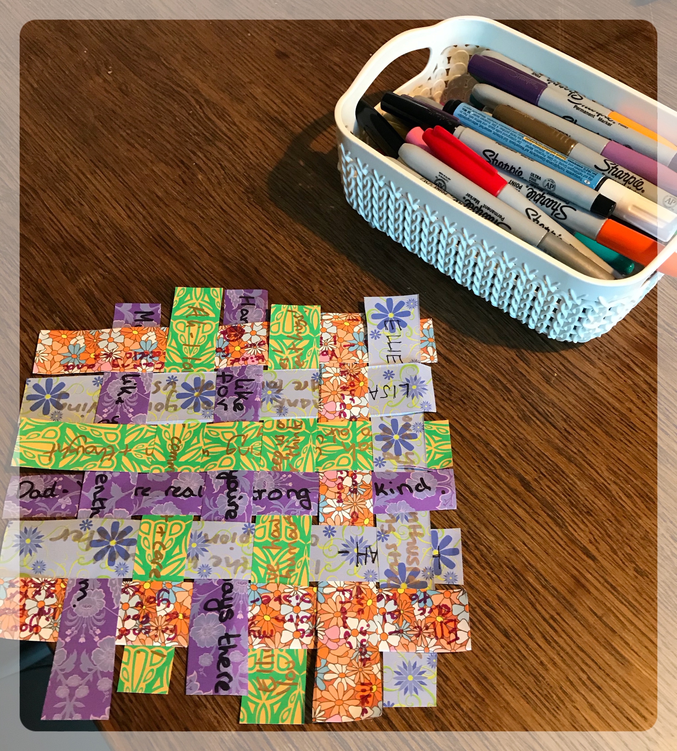 Taking that idea of being woven into a tapestry of love – we have done just that! In the image to the right you will see we just used some sharpies and strips of colourful paper. There are four of us in our family, we each had three strips and wrote on them something we loved about the other members of our family (some of us found this easier to write down than say it out loud) – then we passed them to the right people for them to read before weaving them together.